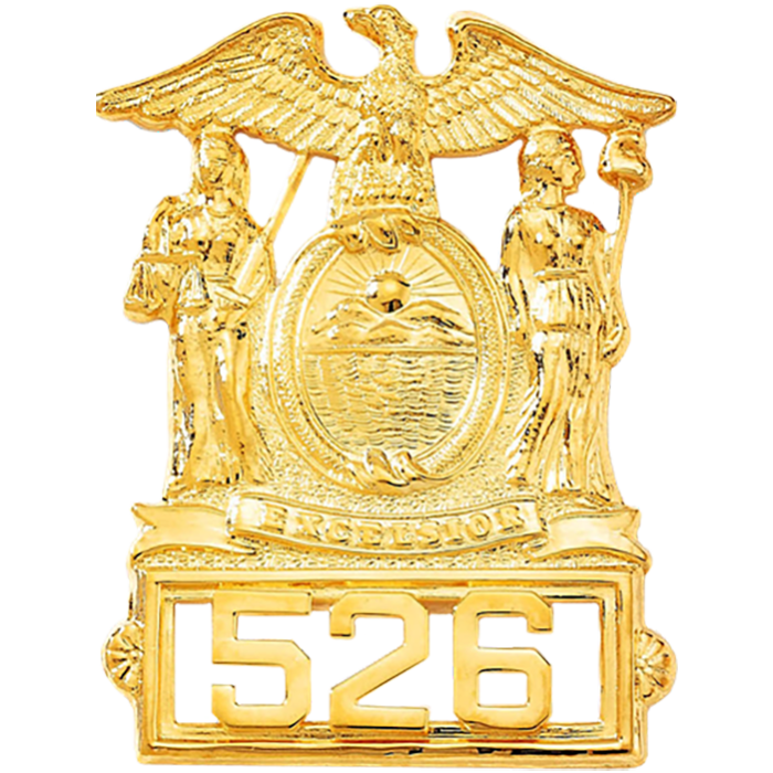 This classic badge boasts both the New York Coat of Arms and an open rectangular area at the bottom for applied letters or numbers! For an engravable panel above number panel, use model B614A. Available either with cut out numbers or letters or with a solid, lettered panel. If not specified item will be supplied with open panel. May take a A2520 enameled panel. Specify title and color.