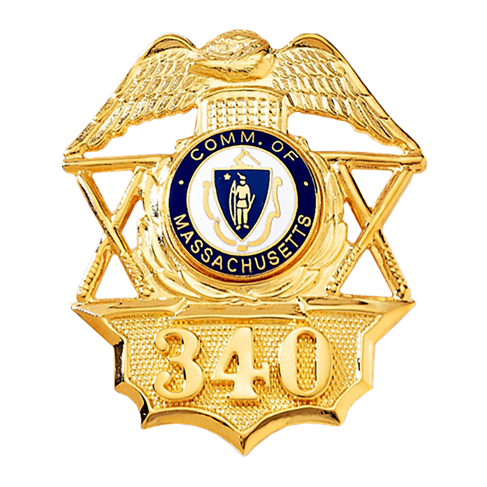 This badge is like no other, with crossed beams on either side of the centerpiece area, plus an eagle at the top and a bottom area featuring a pebbled background! Available with applied numbers or letters as shown. Number of characters will determine size of lettering.