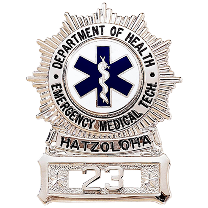 This old-timer features sunburst rays surrounding a large ring for lettering, plus an additional ribbon and a large bottom panel for applied letters, numbers, or solid panel for lettering! Shown with numbers and stars on a partially open panel. If 3 or less applied numbers there will be stars. If > 3 applied characters there will be no stars. This badge can also be ordered with a solid, lettered panel.