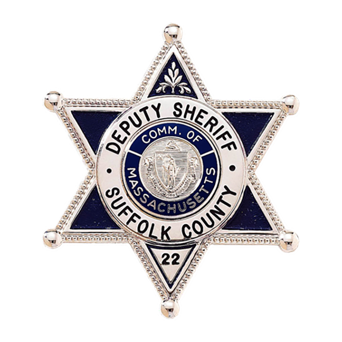 Decorative six point star with ball points. The top point features a filigree which is in the die. Shown with a 15/16" seal. If an 11/16" seal is used the center will have rays showing between seal in panel. This version also includes enamel coloring of your choice in the background! May be supplied with 11/16" seal. Specify seal size or 15/16" size will be used. Star points will be same color as lettering unless otherwise specified. This badge is available without a colored enamel background. See model B751. For a smaller badge, see model B1264-DE.