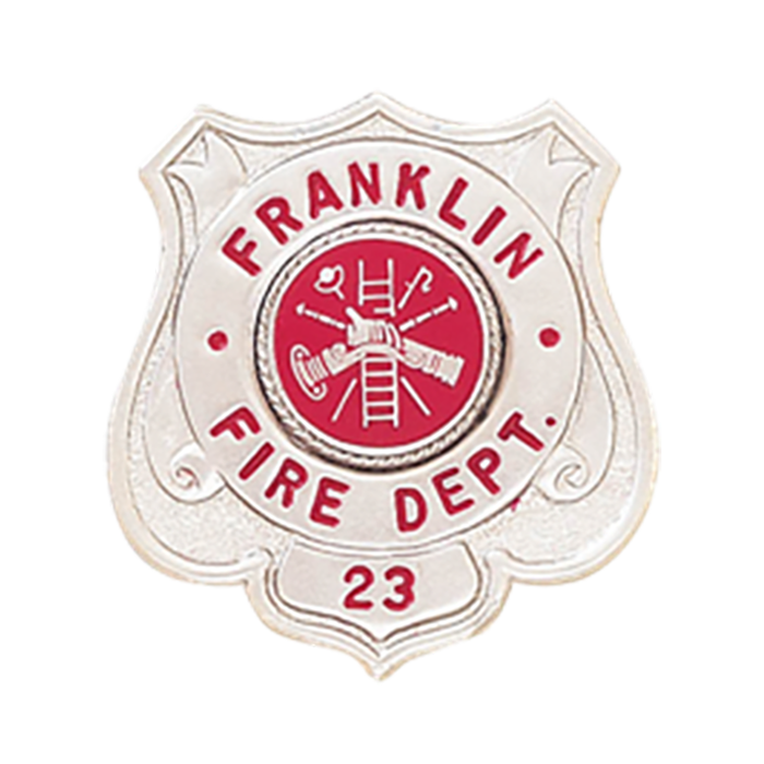 This conveniently-sized shield badge includes three areas for lettering! Also available with enameled background. Use style B808-DE for enameled background. Not available in hard enamel or roman font.