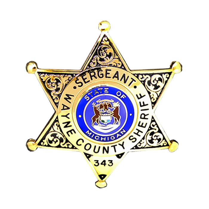 This version of the B812 6-point Star Badge with a circular panel includes embedded lettering for Wayne County Sheriff's Office and comes with enamel coloring of your choice in the background!
