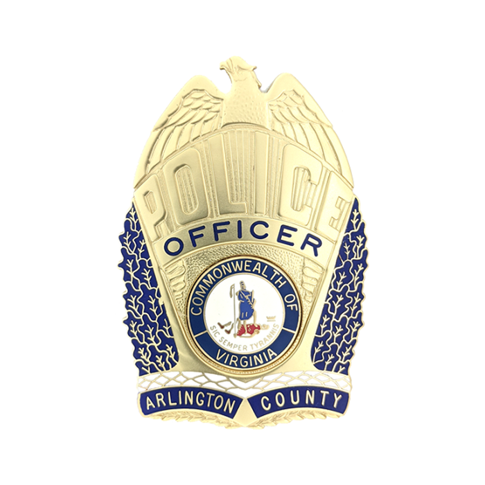 Eagle Top Badge For the Arlington County Police Department. POLICE, ARLINGTON and COUNTY are built into the die of the badge and may not be changed.