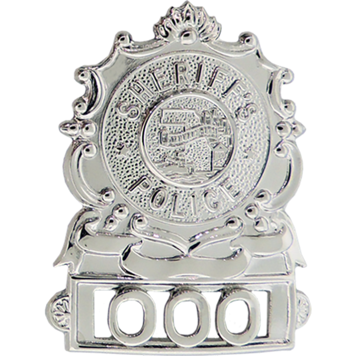The Sheriff's Police of Cook County use this specialized classic badge style! Lettering and the Cook County Seal are built into the die and cannot be changed. 1/2" seal may be applied over the seal in the die at an additional charge. Available with either cut out numbers or letters on open panel or solid, lettered panel.
