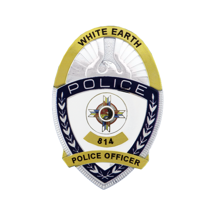 Police, wreath, and panels in die and cannot be changed. Standard reverse enamel is white background with blue POLICE background. Use FLX2624 when titles other than "Police" are required.