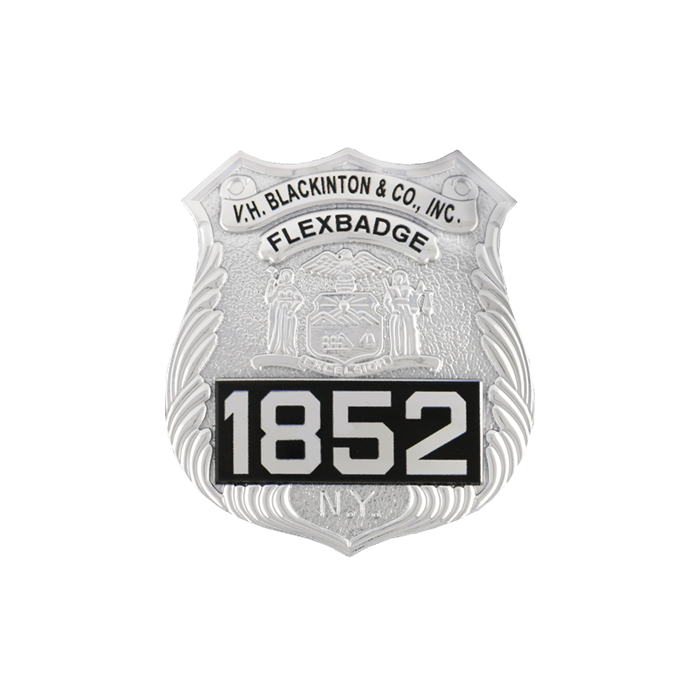 New York FlexBadge Shield with three lines of engraving similar to metal badge model B1455.