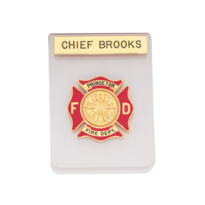 Clearview plastic pocket identity clip easily slides into breast pocket. The maximum badge width for this clip is 2 1/2". The pocket clip comes with one name bar at the top. Badge sold separately. Shown here with one bar.