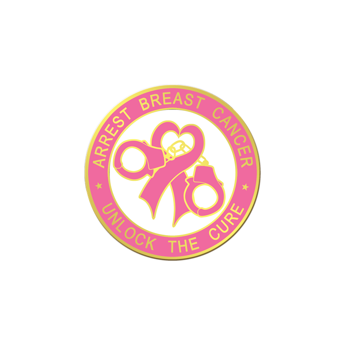 Show your support for Breast Cancer Awareness with this stunning 15/16" pin which states “Arrest Breast Cancer & unlock the cure” in the die around the rim. Gold Plate with Clutch Back Pin Attachment. Colors: White and PMS237. 10% of all sales are donated to Breast Cancer research and support charities.