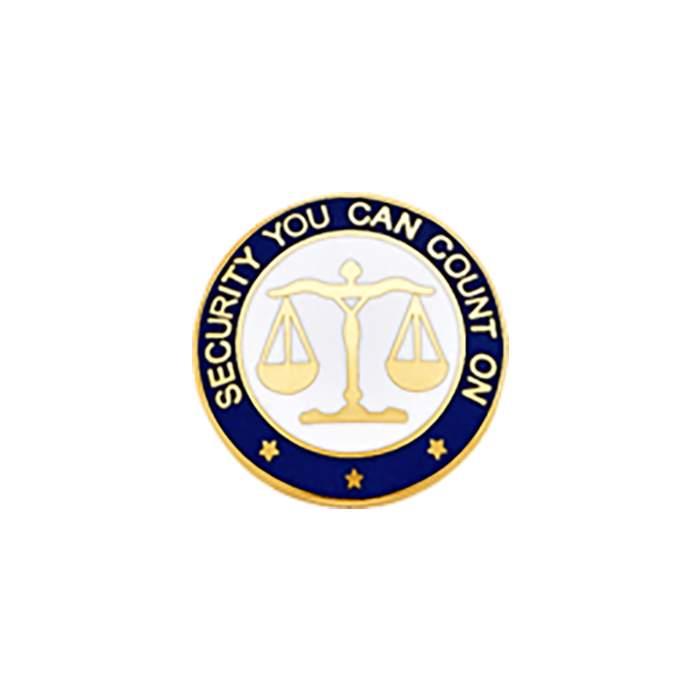 Scales of Justice Seal with "Security You Can Count On" around the rim of the seal. Available in several finishes and sizes. Available in 15/16" (0.9375"), 7/8" (0.875"), 3/4" (0.75"), 5/8" (0.625"), and 1/2" (0.5"). This item can be placed on a badge, but only on Smith & Warren Badges. This item cannot be placed on a Blackinton Badge or on any EPoliceSupply In Stock Badge.