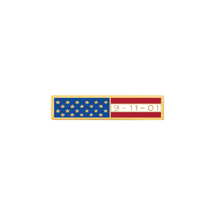 Beautiful four section bar resembling the American flag with stars and three stripes and 9-11-01 in the middle stripe. Wear with pride to recognize the remembrance of courage, sacrifice, and resilience. If this bar is needed to fit into a bar holder, use model A12340 (5/16").