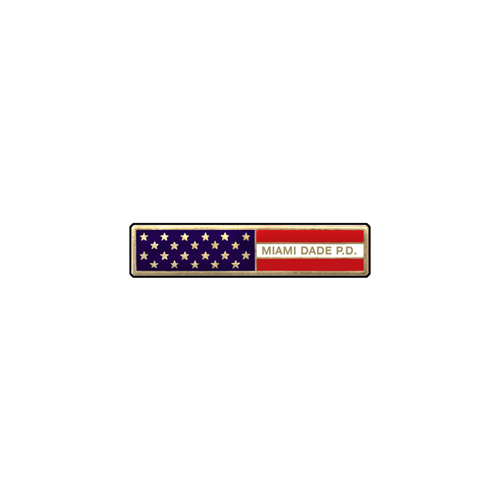 Beautiful four section bar resembling the American flag with stars and three stripes with Miami-Dade P.D. in the middle stripe. Wear as a patriotic symbol showing your American pride. The wording / text is in the die and cannot be changed.