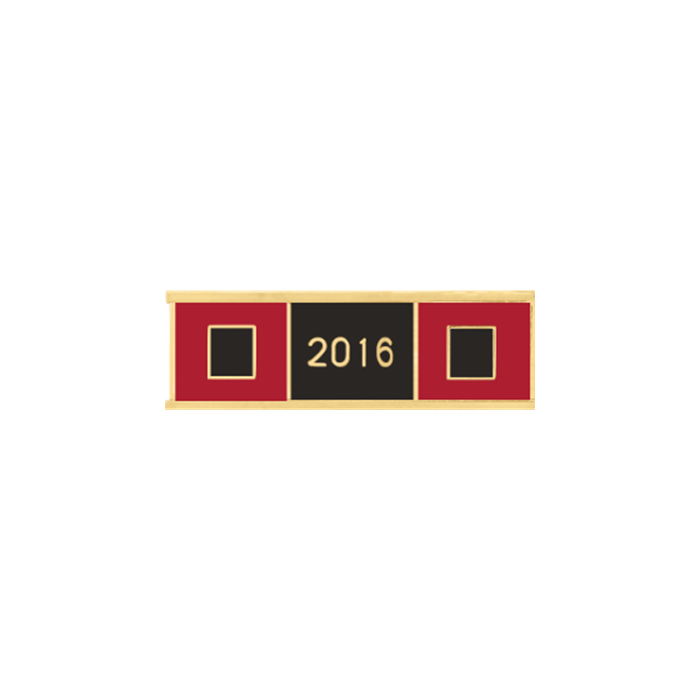 Unique five section commendation bar with 2016 in the die in the center section. The sides contain squares which can be enameled the colors in the Hurricane flag, a great way to recognize first responder hurricane recovery efforts. The wording / text is in the die and cannot be changed.