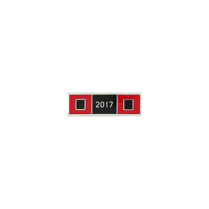 Unique five section commendation bar with 2017 in the die in the center section. The sides contain squares which can be enameled the colors in the Hurricane flag, a great way to recognize first responder hurricane recovery efforts. The wording / text is in the die and cannot be changed.