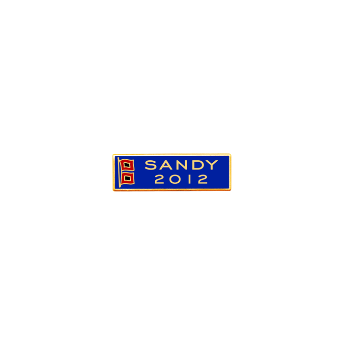 Gol-Tone or Rhodium 2012 Hurricane Sandy Commendation bar with Hurricane flag. The wording / text is in the die and cannot be changed. The symbol(s) are built into the die and cannot be changed.