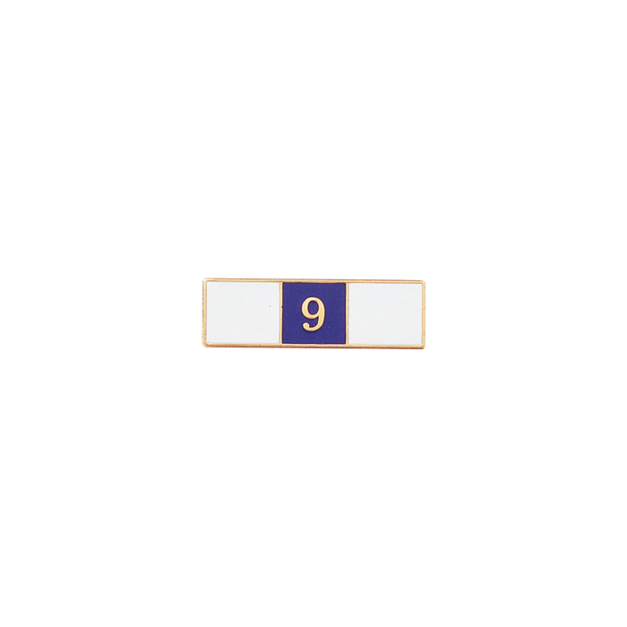 This impressive three section bar with a 9 in the middle section can be customized with your selection of colors to symbolize exemplary service, appointment to a group or team, 9 years of service and much more. The number is in the die and cannot be changed.