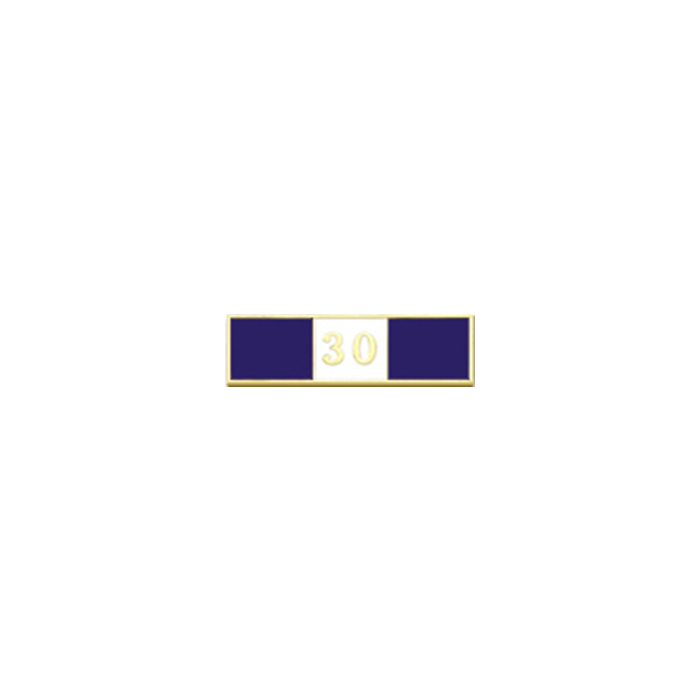This impressive three section bar with an applied 30 in the middle section can be customized with your selection of colors to symbolize exemplary service, appointment to a group or team, 30 years of service and much more. The number is in the die and cannot be changed.