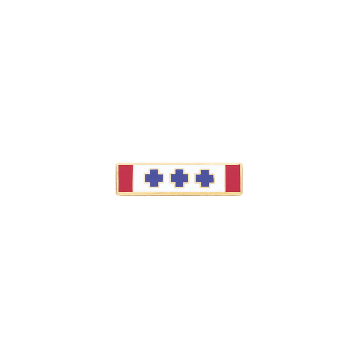 This impressive three section bar has three crosses in the center section and can be customized colors of your choice to symbolize exemplary service, appointment to a group or team, three or fifteen of service, and much more. The 3/8" version of this bar is A10886-B. For one crosses, use model A8074. For two crosses, use model A8074-A. For four crosses, use model A8074-C. The symbols are built into the die and cannot be changed.