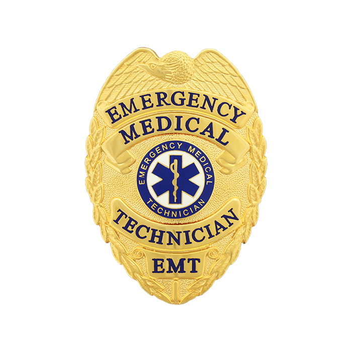 This beautiful eagle top badge features embedded lettering for an Emergency Medical Technician with blue lettering, and your choice of center seal. The badge is a stock badge.