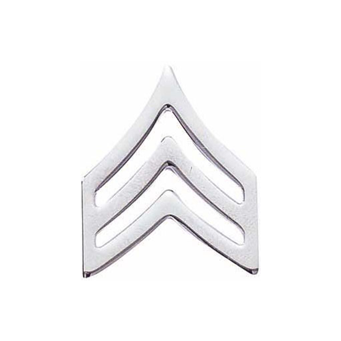 This pin of smooth chevrons for a Sergeant is kept in stock for fast shipment! Sold In Pairs. Available in gold or silver with clutch back attachment(s).