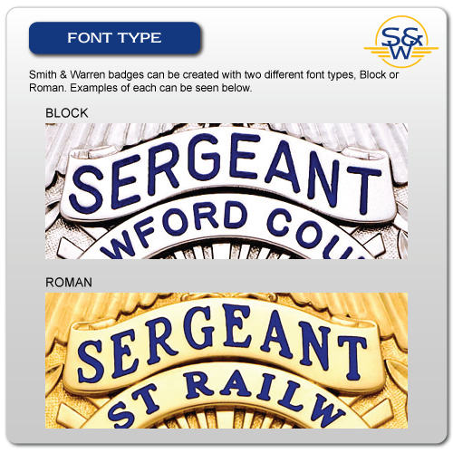 The most common font is BLOCK and is used in 90% of the badges in the USA. Please see the image below for examples of BLOCK and ROMAN fonts: