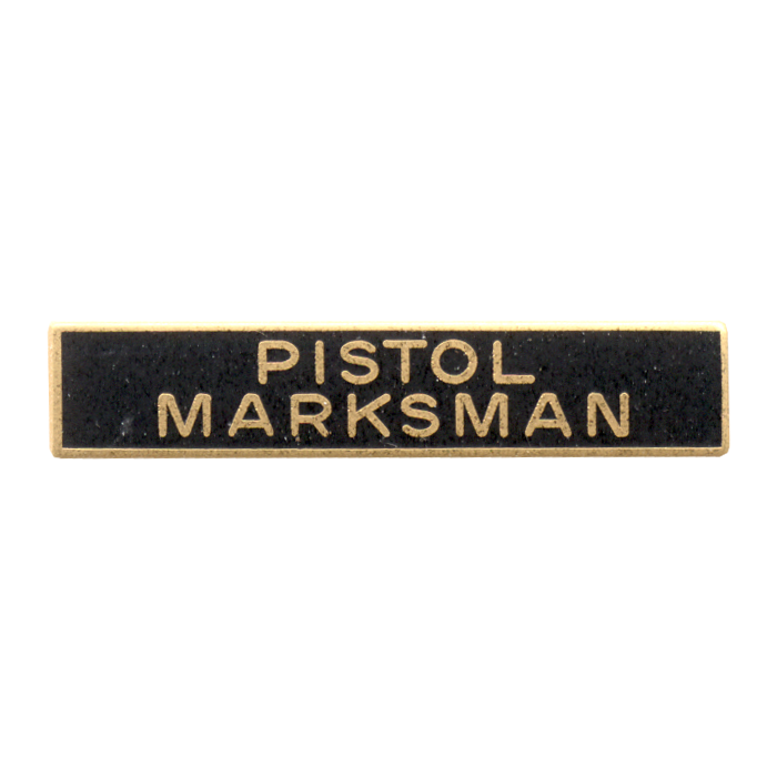 Quality Pistol Marksman enamel marksmanship bar. This stunning bar can take the enamel color of your choice. The wording is in the die and cannot be changed.