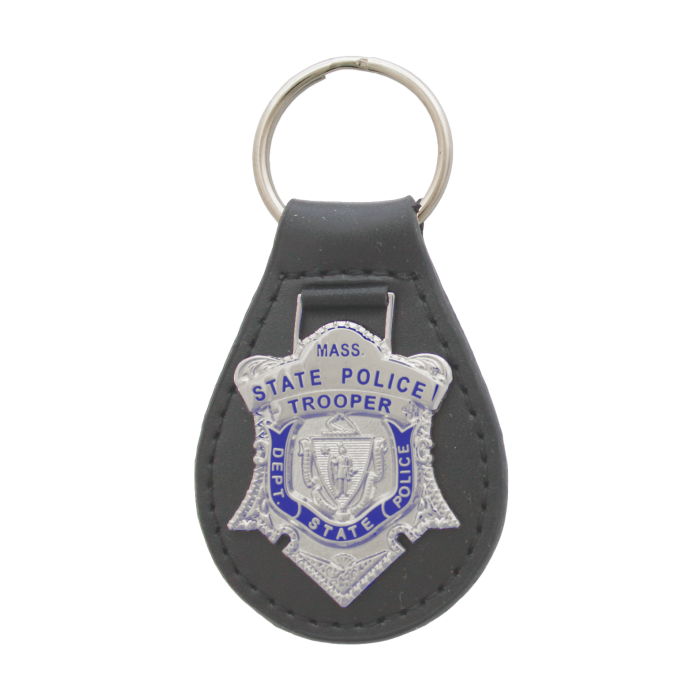 Massachusetts State Police Badge Keychain in Silver on leather key fob.