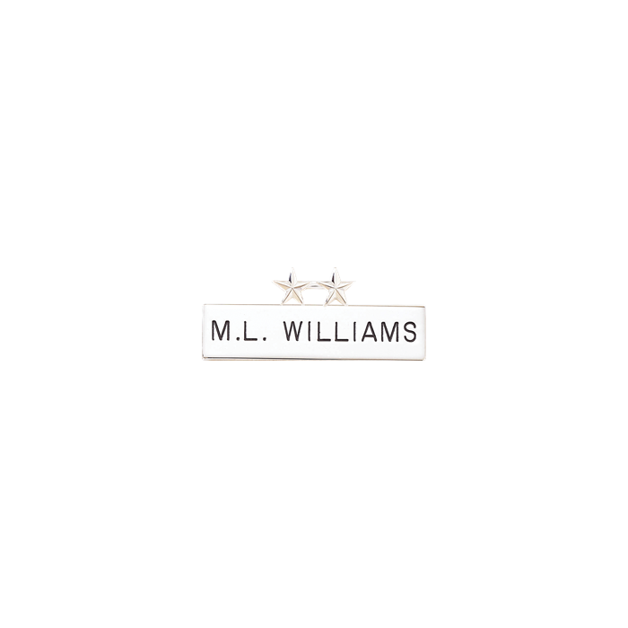 Exceptional quality name bar that is engraved and plated to order with two 1/2" smooth applied stars (star style# A4887).