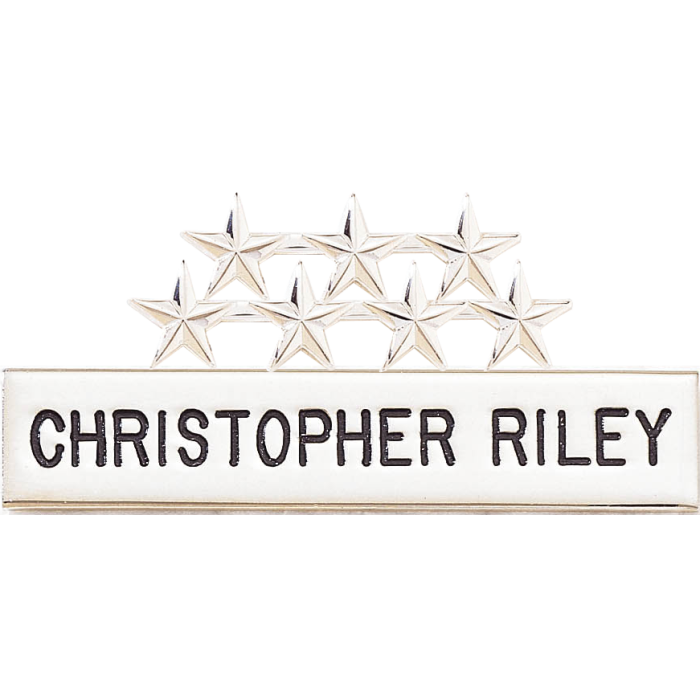 Exceptional quality name bar that is engraved and plated to order with seven 1/2" smooth applied stars (star style# A4887).