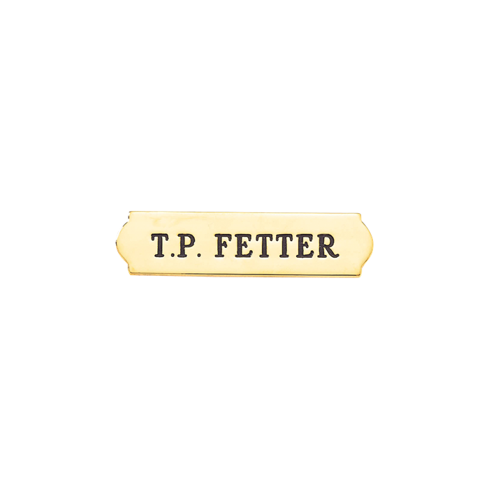 Exceptional quality name bar with scalloped corners that is engraved and plated to order.