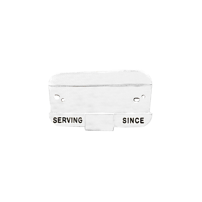 Exceptional quality name bar holder that is engraved and plated to order. The Serving Since is in the die and can not be taken out. This holder fits name bars that are 1/2" in height and 2" Wide. This holder fits the A10009 name bar.