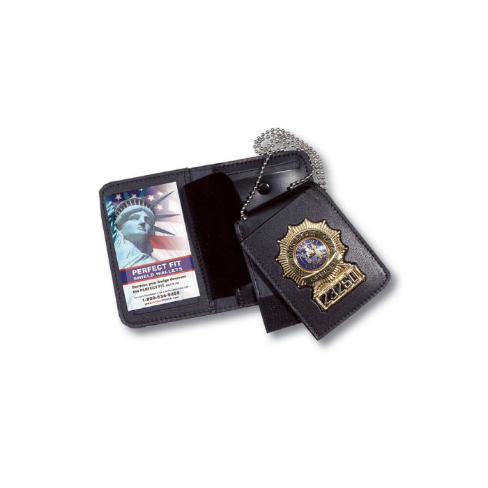Styles: 113, 127. This duty leather book style case is custom cut to fit your custom badge. It is made from Top Grain Leather with rounded and stitched corners for maximum durability. Removable badge section can be worn around neck, on a belt or in a blazer pocket. The 30" beaded chain is included. Badges not included.