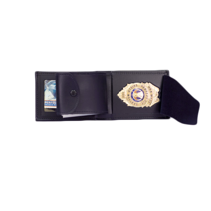 Styles: 102, 102S. This dress leather notepad style wallet is custom cut to fit your custom badge. Corners are turned and stitched for a sharp finish. Bill-fold compartment is bi-fold. This wallet does not have credit card slots. It is supplied with 8 picture sleeve.