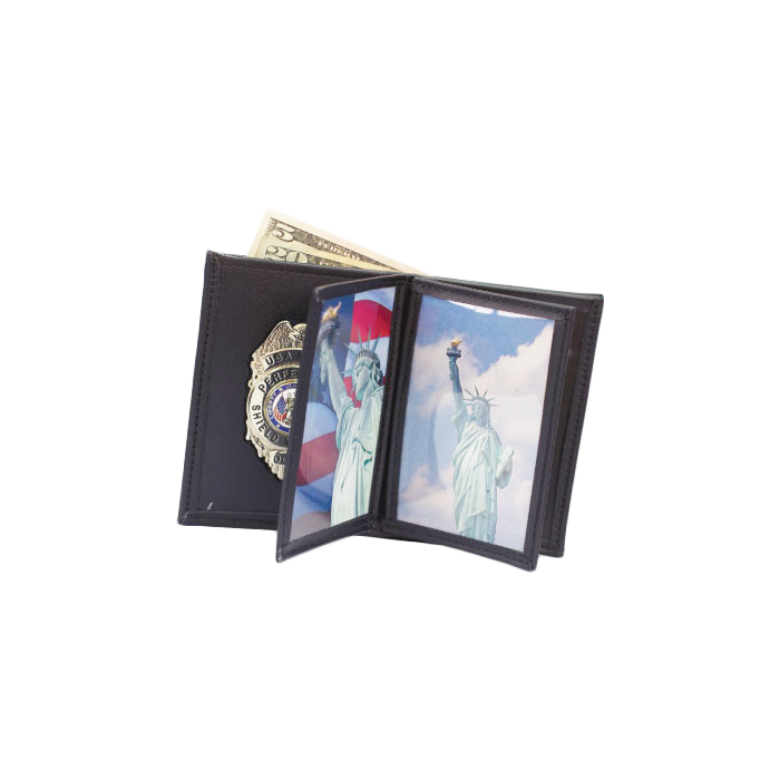 Styles: 120A, 121A. Made from top grain leather with turned and stitched corners for a high quality finish, this "federal" style wallet fits credentials of any size. Some of its prominent features are two separate flipping ID sections, 3 credit card compartments, the badge safely concealed on the left and plastic picture sleeve. The money compartment is bi-fold. There is nothing this wallet will not hold.