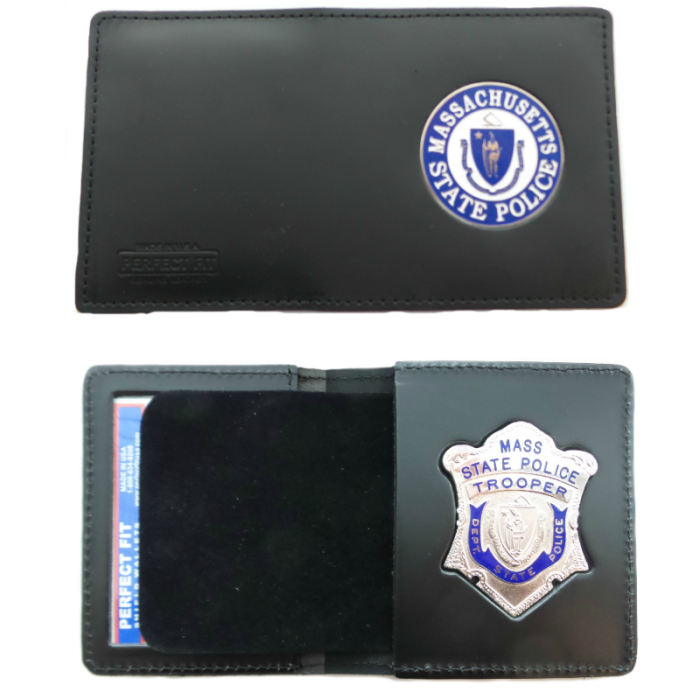 Style: PF99. This single ID & badge case has an inside custom cut for badge cutout 458. It also includes a Massachusetts State Police Medallion on the front. Made from genuine top grain leather with rounded and stitched corners for maximum durability. The ID window is 2.5" X 3.75".