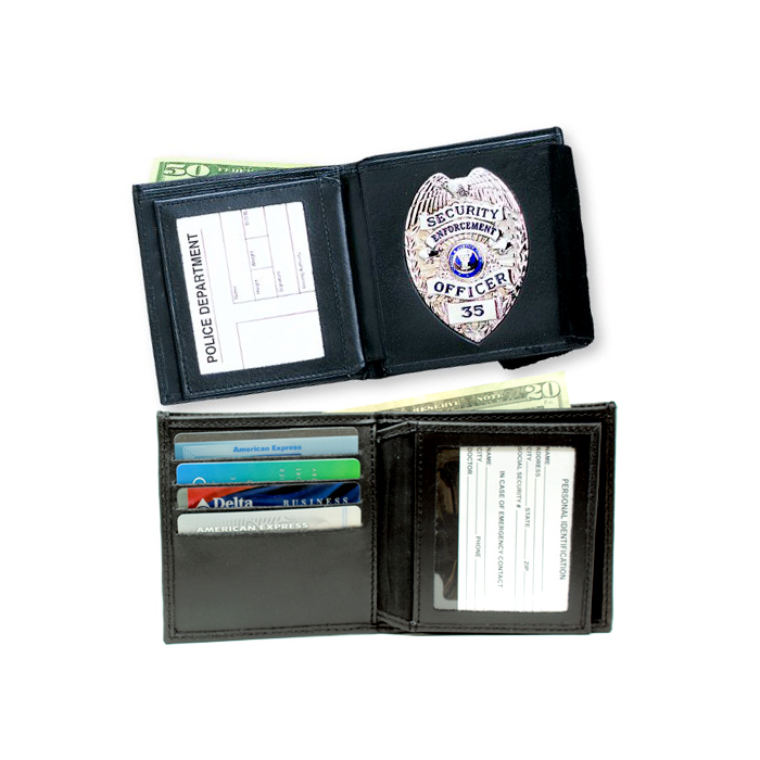 Styles: 79500. This wallet features a back-to-back ID section along with money and credit card sections. The badge cutout area is designed to accommodate larger badges. Badge and money not included. If you would like that badge, see model B879.