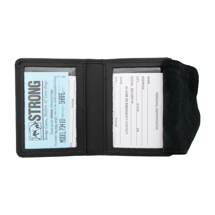 Styles: 73400, 73410, 73414, 73420, 73500, 73700, 73780STW. These Dress cases hold 2 ID cards, separated by a suede divider. This ID case is embossed with your choice of lettering and a state seal or seal of your choice. Black leather cases are great for concealed carry permits and are available in a variety of sizes. The 73700 is designed to hold a commission book and the 73780 is the same with a Slide Thru Window. The 73414 has one ID and leather pocket without divider. Price includes embossed seal and two line of embossing.