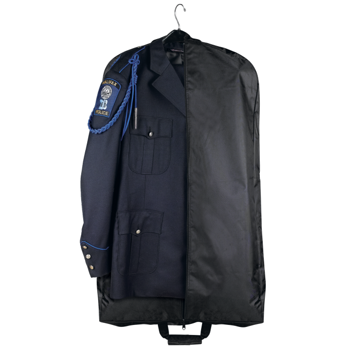 Great to carry your Class A uniform. Two outside zippered pockets for shirts and shoes. Folds in half for easy carry. Made of 840 denier nylon with a PVC lining making it easy to clean and water resistant.
