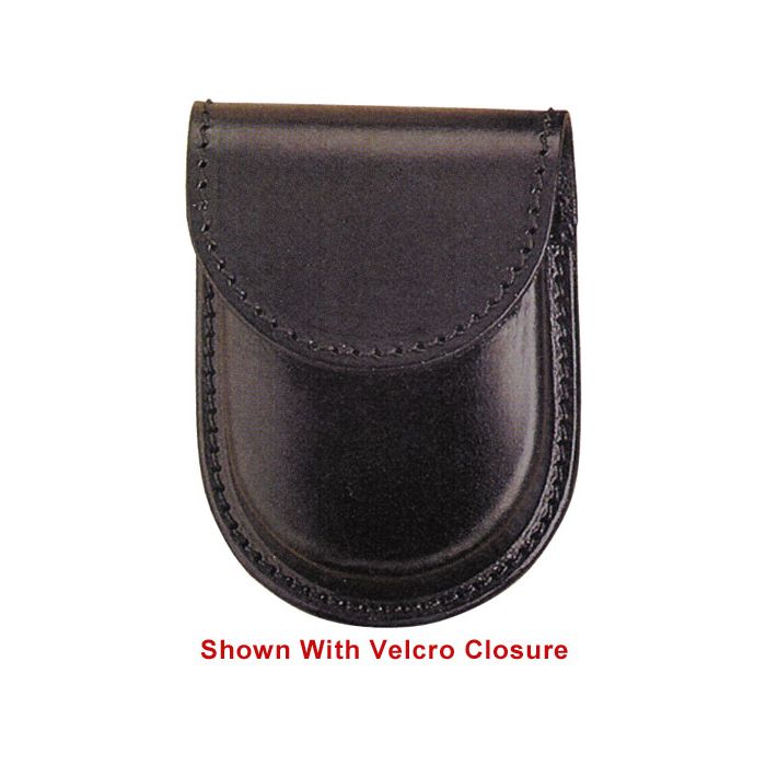 Styles: A501, A501V, A501HC. Compact handcuff case for standard or hinged handcuffs. Fits belts up to 2-1/2" wide. Available in Black in plain, basketweave, and high-gloss Clarino. Available closures include nickel, brass, and black snaps; hidden snaps; or with Velcro (Shown).