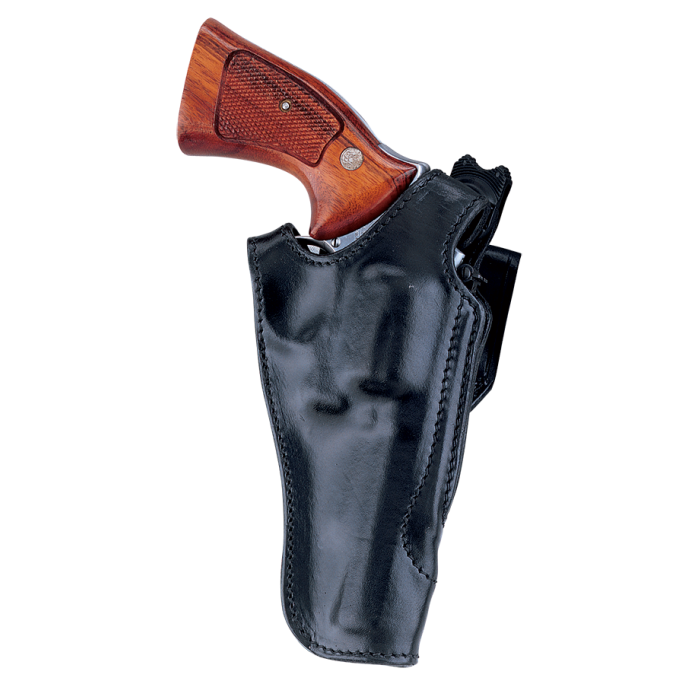 Piece-Keeper security design with covered trigger guard that helps prevent removal from above or behind. Spring open front allows easy release of gun but remains securely closed when gun is in holster. For medium-frame revolvers with 4" barrel. Available lined, in black, with plain or basketweave finish. Gun not included.