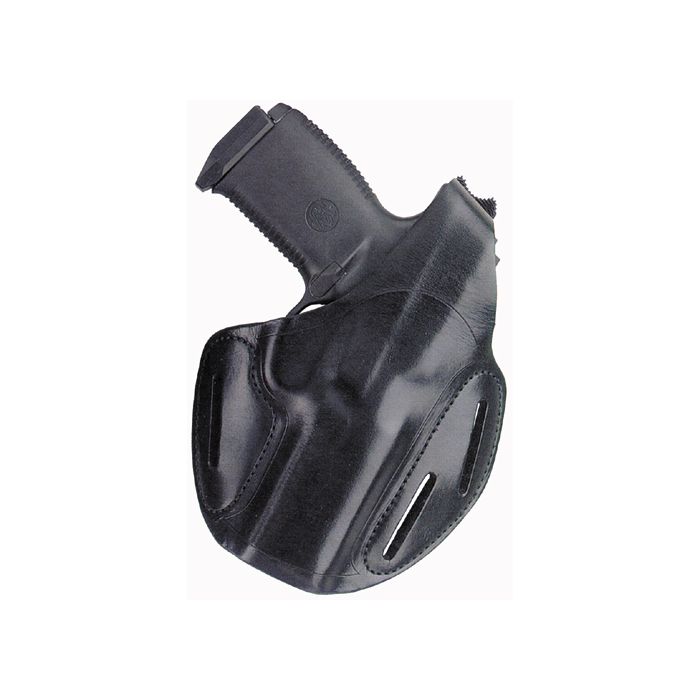 Here's the original "pancake holster", often imitated but never matched. The First Chance holsters ride high and snug, and fits unobtrusively against your body. All First Chance holsters have a covered trigger for your added protection and reinforced thumb break. The three belt slots design can be worn conventionally or as a cross-draw holster. All are available with 1.75" belt loops and available for revolvers in 2"-4" barrels and semiautos. Gun not included.