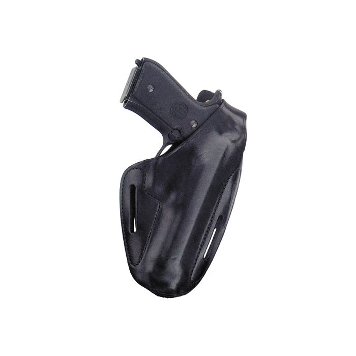 Here's the original "pancake holster", often imitated but never matched. The First Chance holsters ride high and snug, and fits unobtrusively against your body. All First Chance holsters have a covered trigger for your added protection and metal reinforced thumb break. The three belt slots design can be worn conventionally or as a cross-draw holster. All are available with 1.75" belt loops and available for revolvers in 2"-4" barrels and semi-autos. Gun not included.