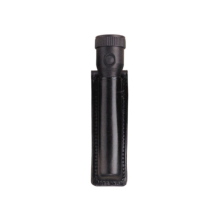 Leather Duty Belt Flashlight Holder with no closure. Snaps on a 2 1/4" belt with a one way snap. Available in Black in plain, basketweave, and high-gloss Clarino. Flashlight not included. Available in the following sizes: