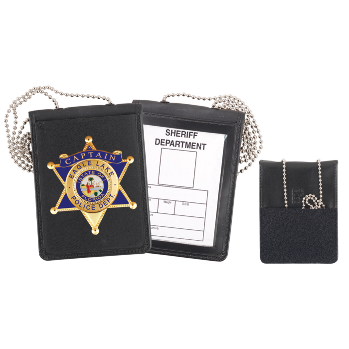 Styles: 71600, 71603, 71610. This holder features a recessed badge section to specifically fit an individual badge and ID section. It also features a Velcro closure and contains an interior storage pocket for the neck chain when not being worn.