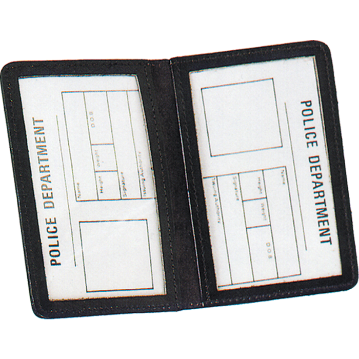 Styles: 83000, 83100, 83200, 83300. English edge Double ID duty leather case with framed windows. This ID case is embossed with your choice of lettering and a state seal or seal of your choice. Duty leather cases are made from thick heavy-duty leather with framed windows. If you would like the thinner dress leather, see style 83500 or 73400. Price includes embossed seal and two line of embossing.