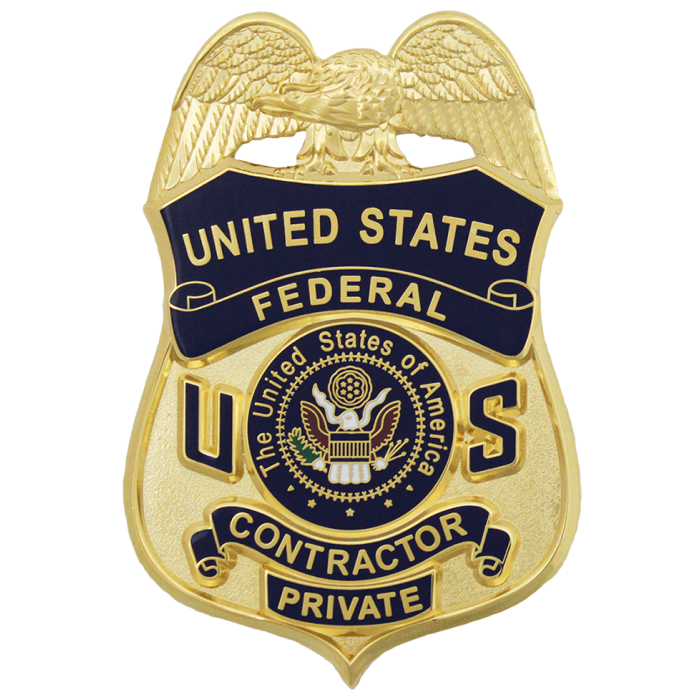 United States Federal Contractor badge. There is a choice of a Pin & Safety Catch attachment as well as Flat with no attachment and glued into a leather wallet or case. All four panels as well as the center seal are built into the die and cannot be changed.